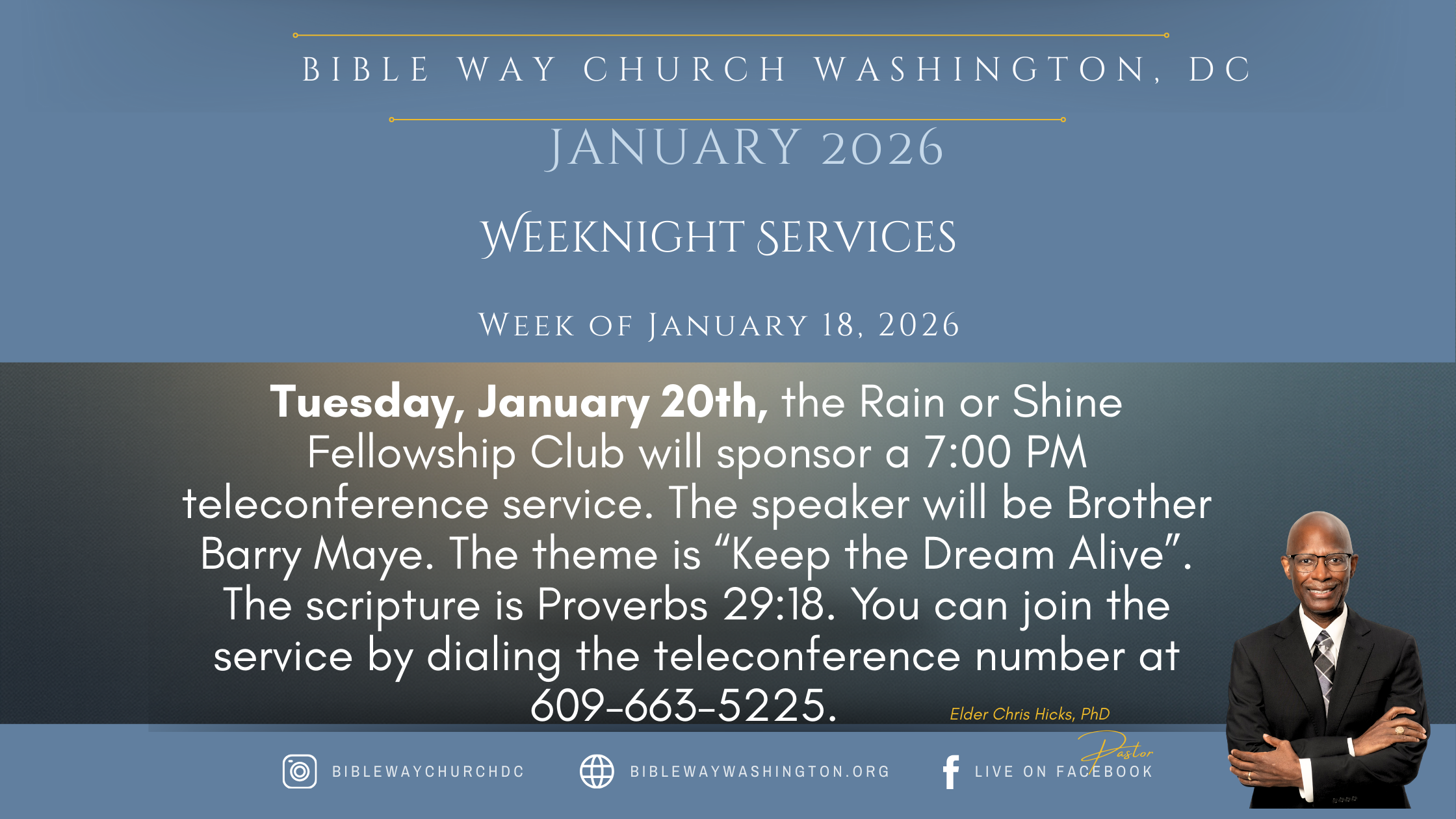 Rain or Shine Fellowship Club will sponsor a 7:00 PM teleconference service. The speaker will be Brother Barry Maye. The theme is “Keep the Dream Alive”. The scripture is Proverbs 29:18. You